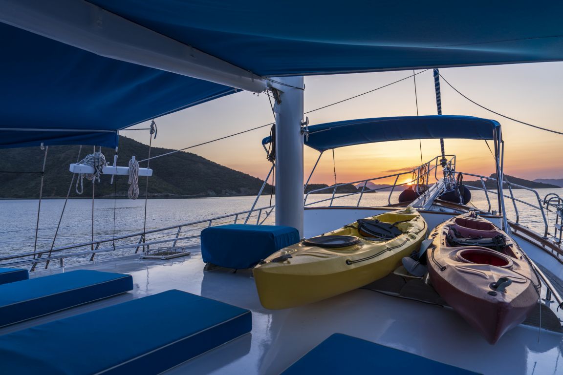 Para los huéspedes que buscan una experiencia activa de yacht charter en Turquía, Elena ofrece paddle board, ringo, esquí acuático y equipo de snorkel, permitiendo explorar aguas cristalinas y calas escondidas.