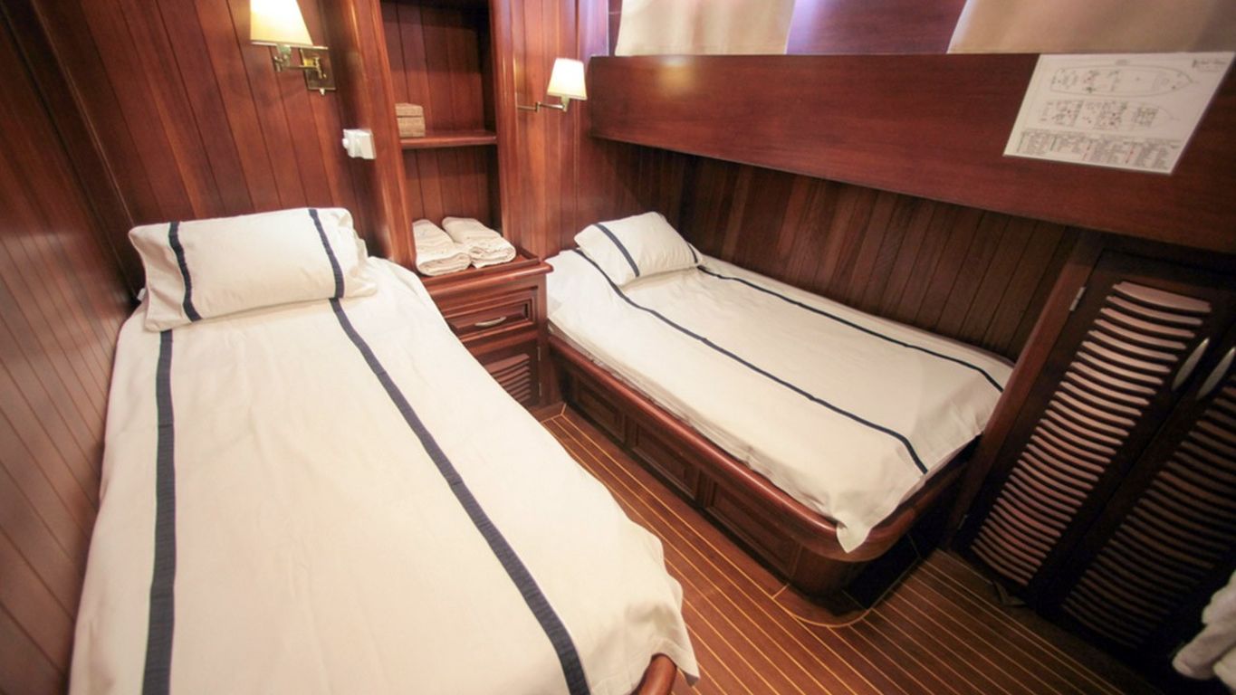 | Capacidad para hasta 10 invitados; 2 cabinas principales, 1 doble, 2 cabinas twin, cabinas de ducha y baños en todas las cabinas, cabinas de tripulación separadas. |