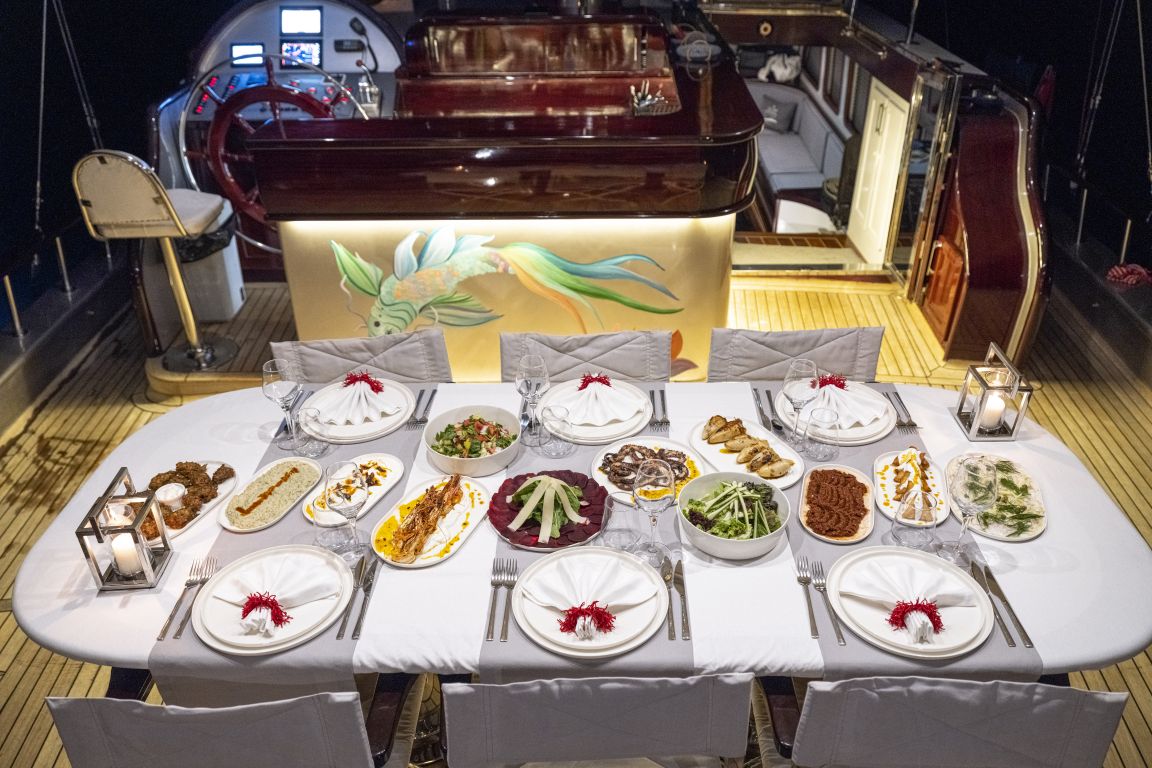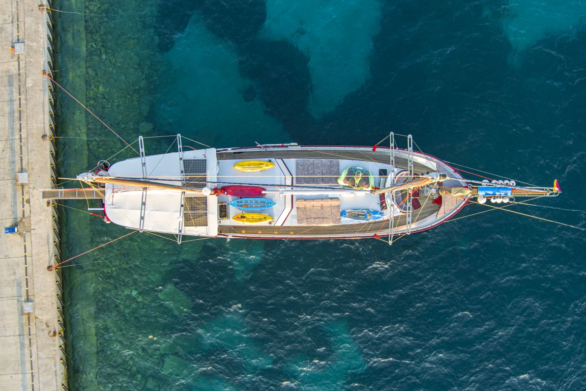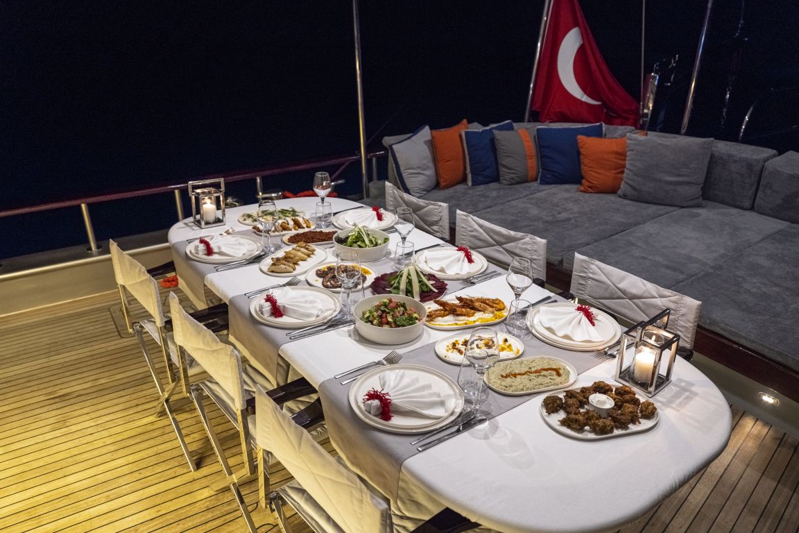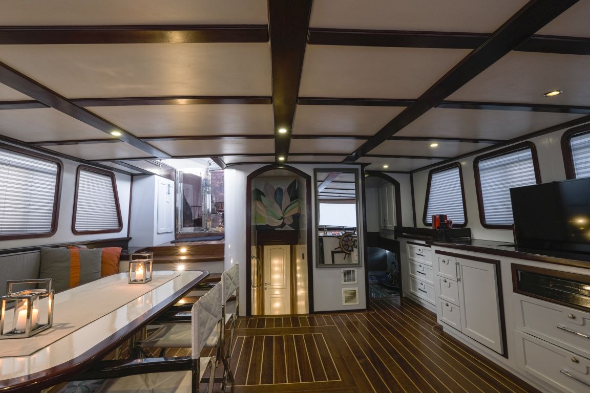 de cruceros azules, como Bodrum, Marmaris, Fethiye y Gocek. Además, en el salón encontrará un televisor LCD, un reproductor de DVD y un equipo de música para el disfrute de nuestros