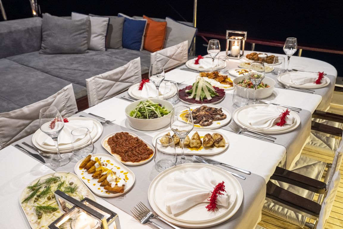 y vajilla para todos los huéspedes. Este yate, que ofrece confort, lujo y tranquilidad a nuestros clientes de cruceros por el mar, puede alcanzar una velocidad de hasta 10 nudos.
