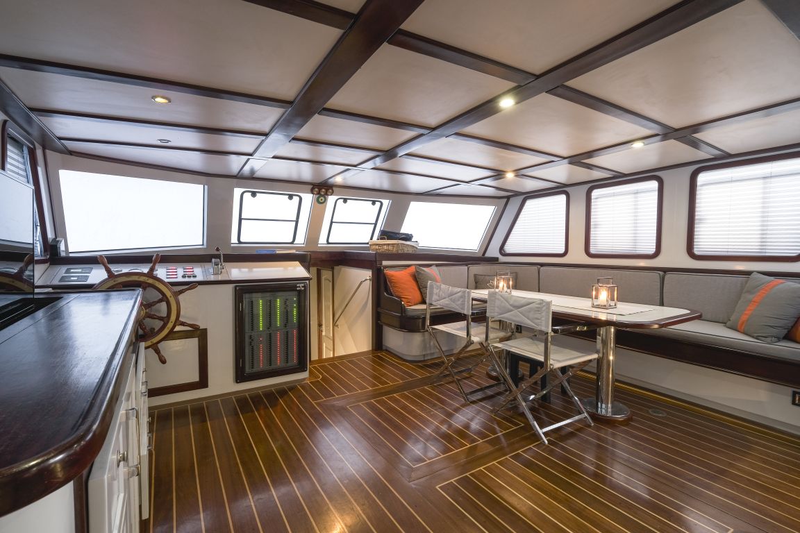la tripulación, una cocina totalmente equipada, comedores interiores y exteriores, aire acondicionado las 24 horas, zonas de relax y un bar americano. Hay suficientes tumbonas, sillas