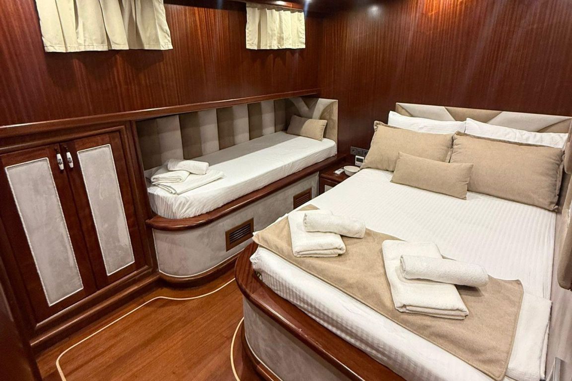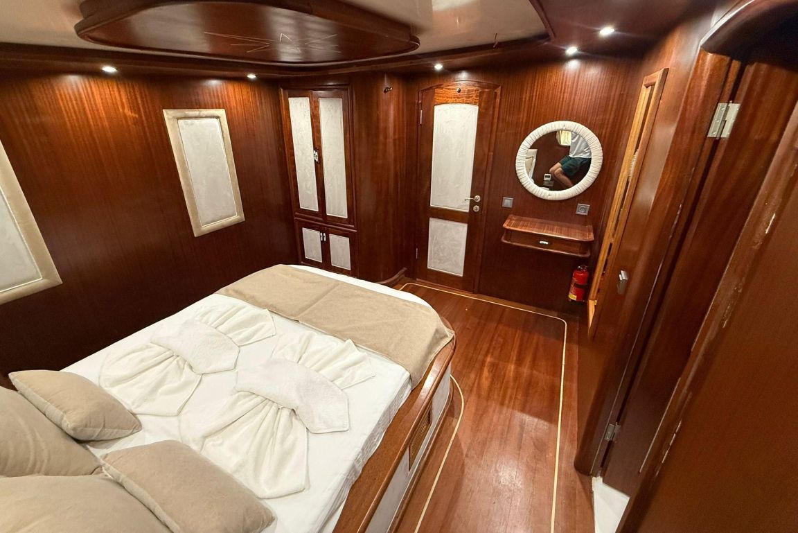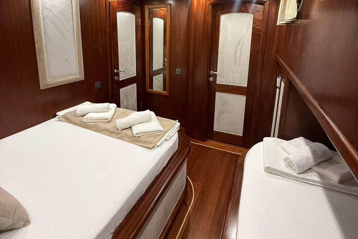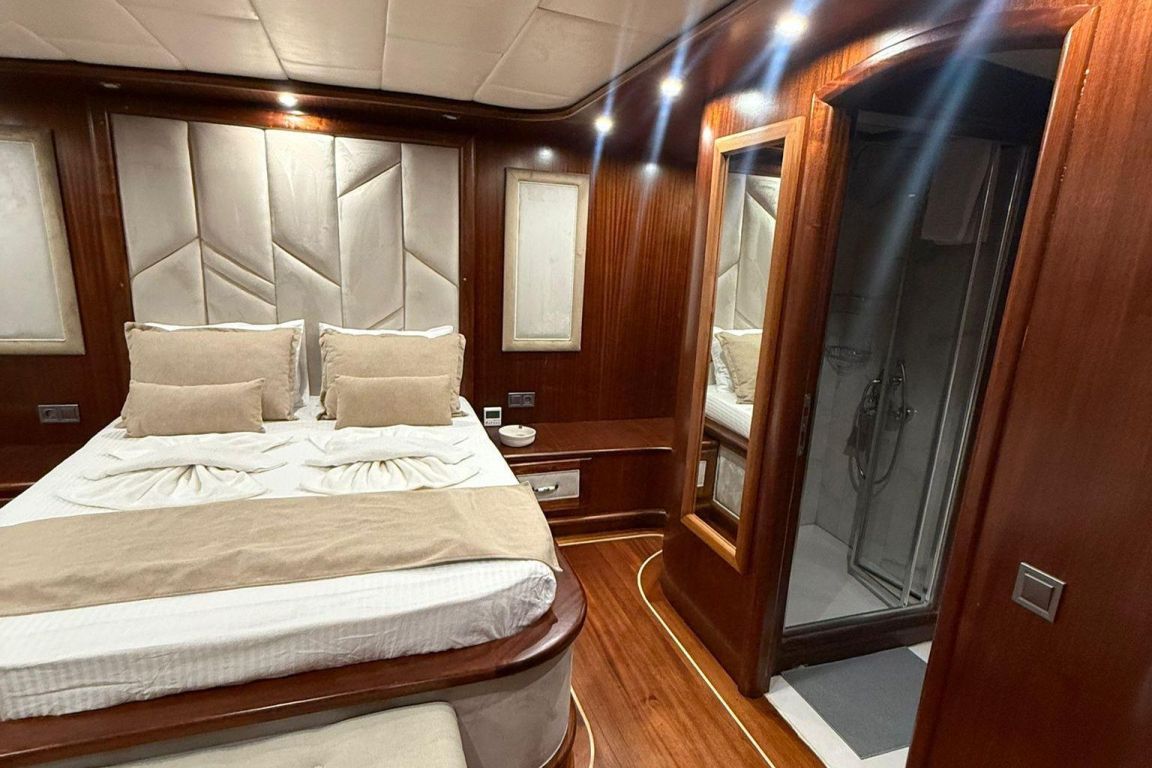 Mare Magico es una goleta de 24 metros diseñada para ofrecer una experiencia excepcional de alquiler privado a lo largo de la costa turca. Con 5 camarotes (2 Master, 1 Doble y 2 Triples) para hasta 12 huéspedes, es una opción ideal para familias y grupos que buscan comodidad, espacio y unas vacaciones Blue Cruise de alta calidad en Turquía. Cada camarote cuenta con aire acondicionado, baño privado y una decoración elegante para garantizar una estancia relajante.