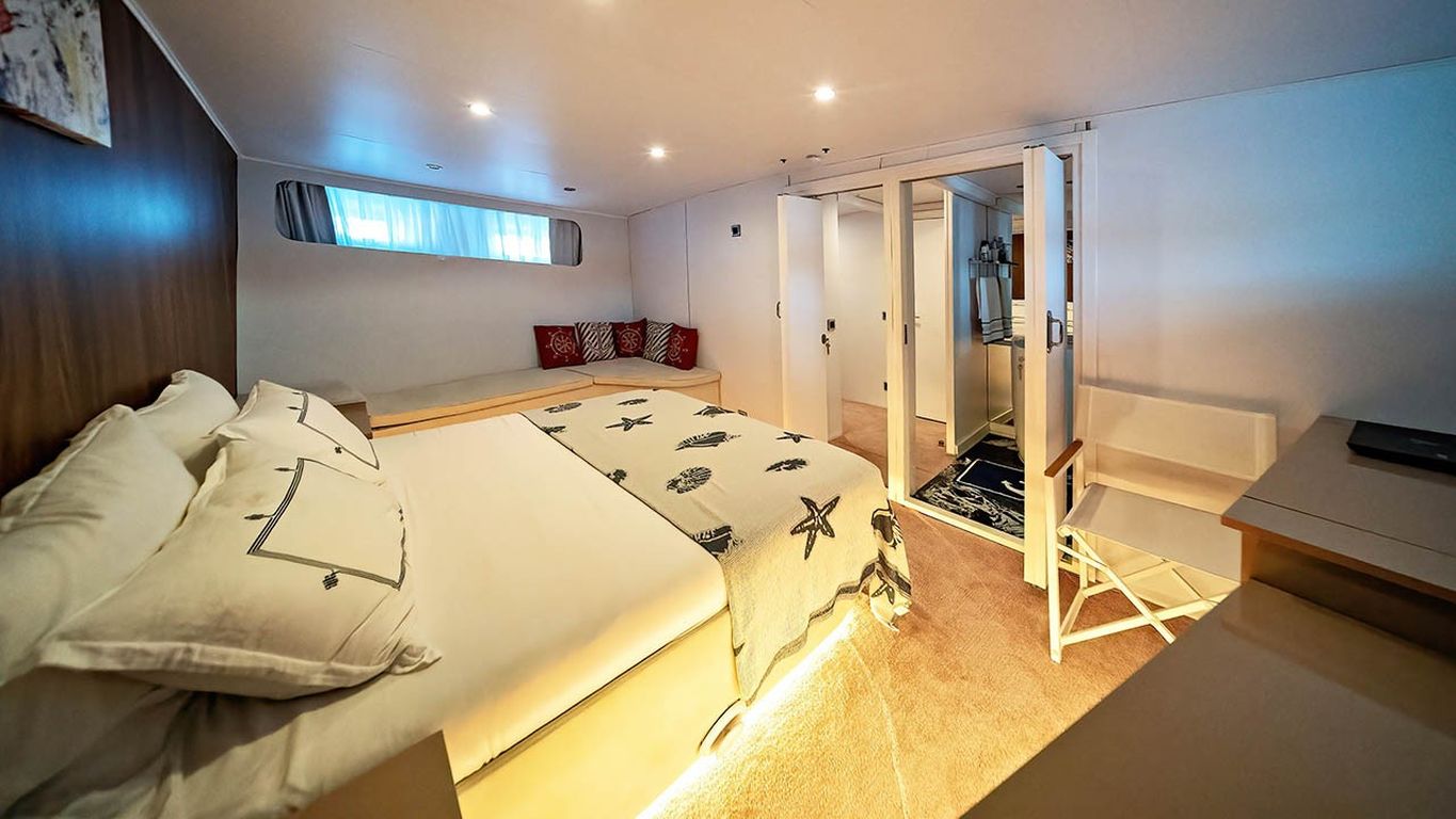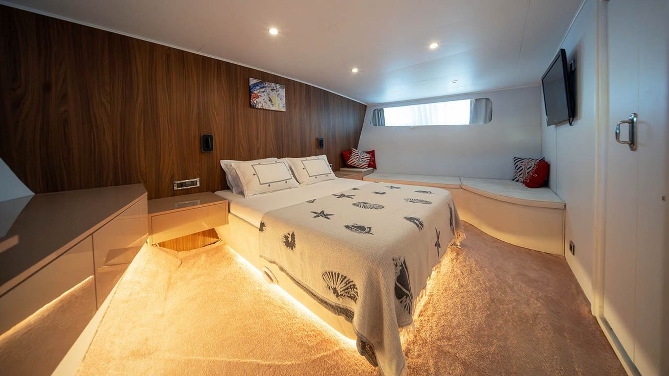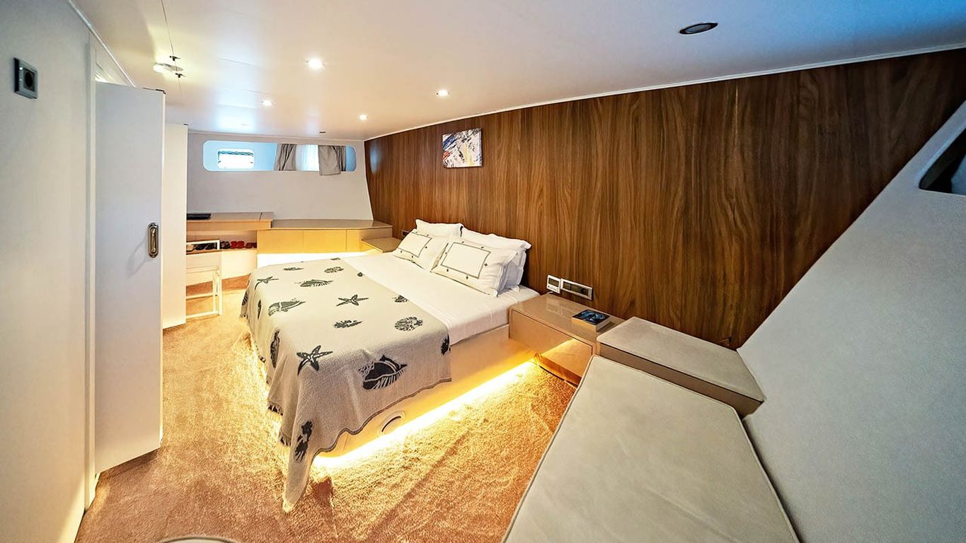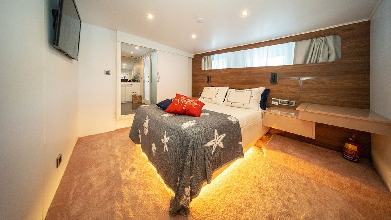 | Capacidad para hasta 10 invitados; 1 camarote principal, 4 camarotes dobles, cabinas de ducha y baños en todos los camarotes, camarotes separados para la tripulación. |