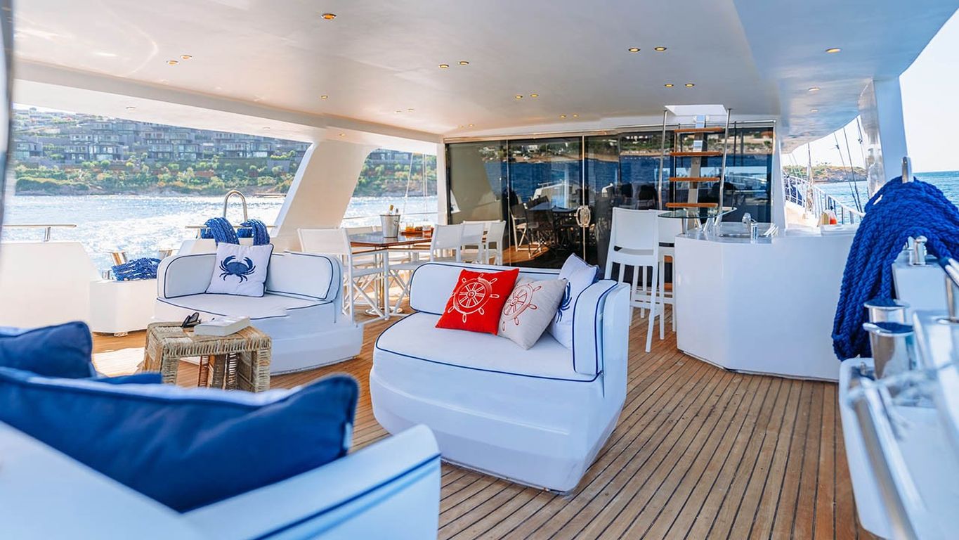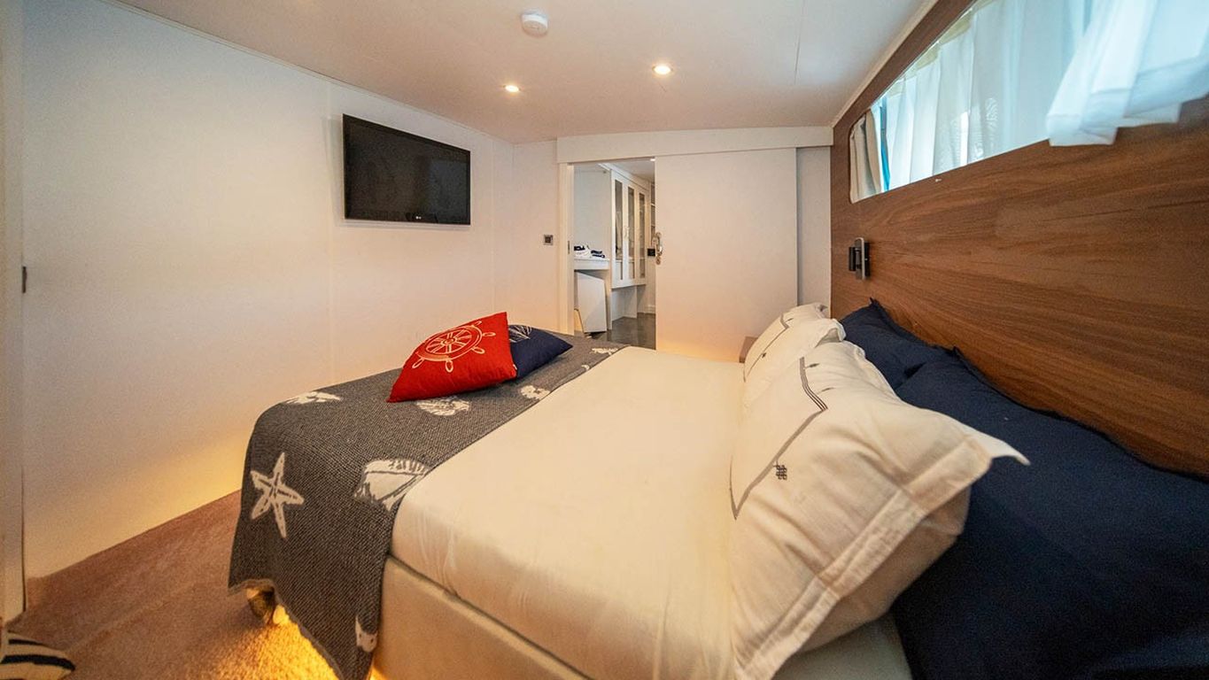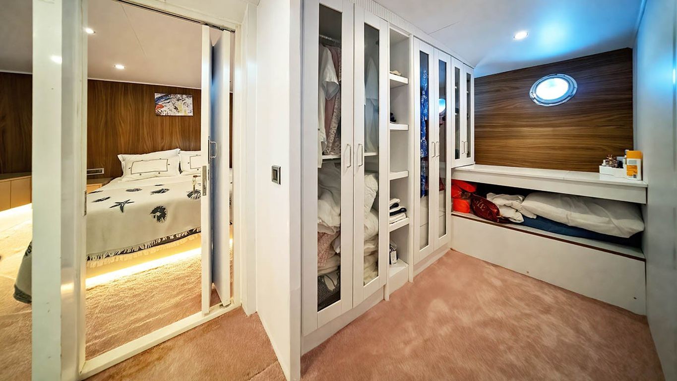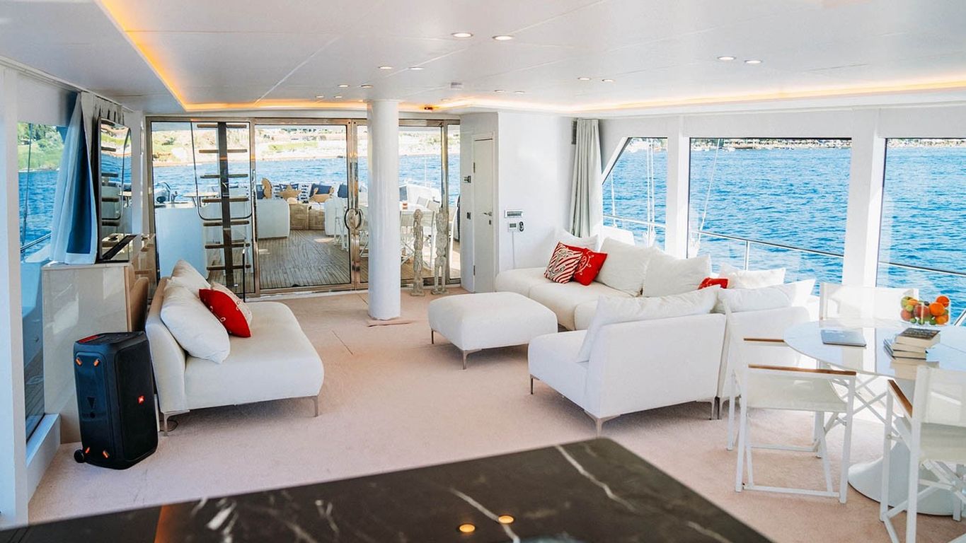 | Capacidad para hasta 10 invitados; 1 camarote principal, 4 camarotes dobles, cabinas de ducha y baños en todos los camarotes, camarotes separados para la tripulación. |