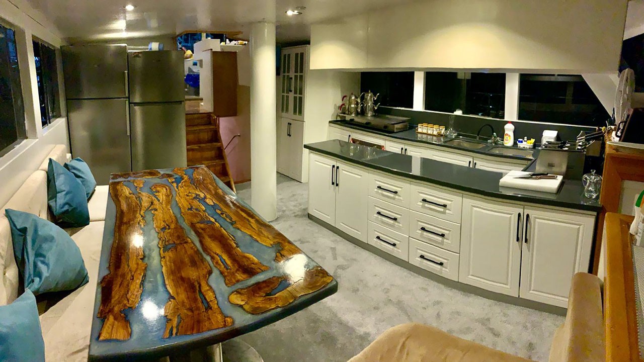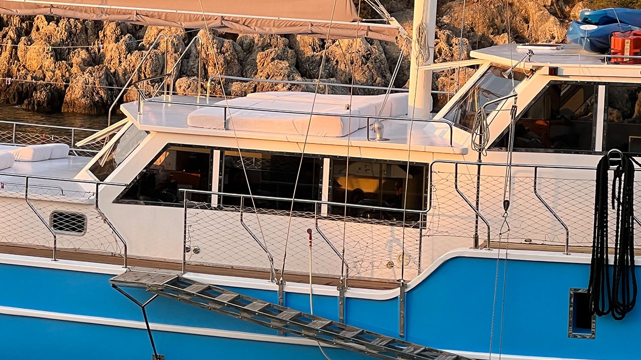 | Embarcación auxiliar con motor fueraborda de 30 HP, tabla de stand up paddle, canoa, equipo de snorkel y pesca, cocina equipada, equipo de seguridad, equipo de navegación, equipo de vela, colchonetas, cubierta con comedor, reproductor de TV/DVD/CD, GPS, radio VHF, Internet Wi-Fi |