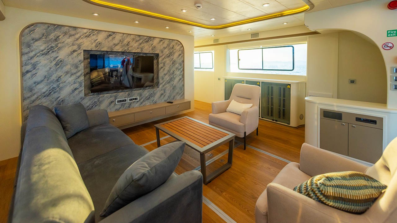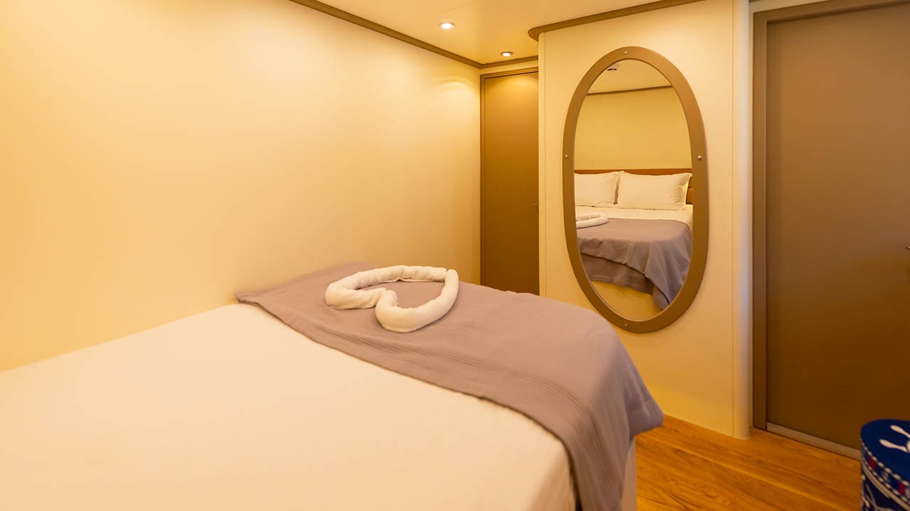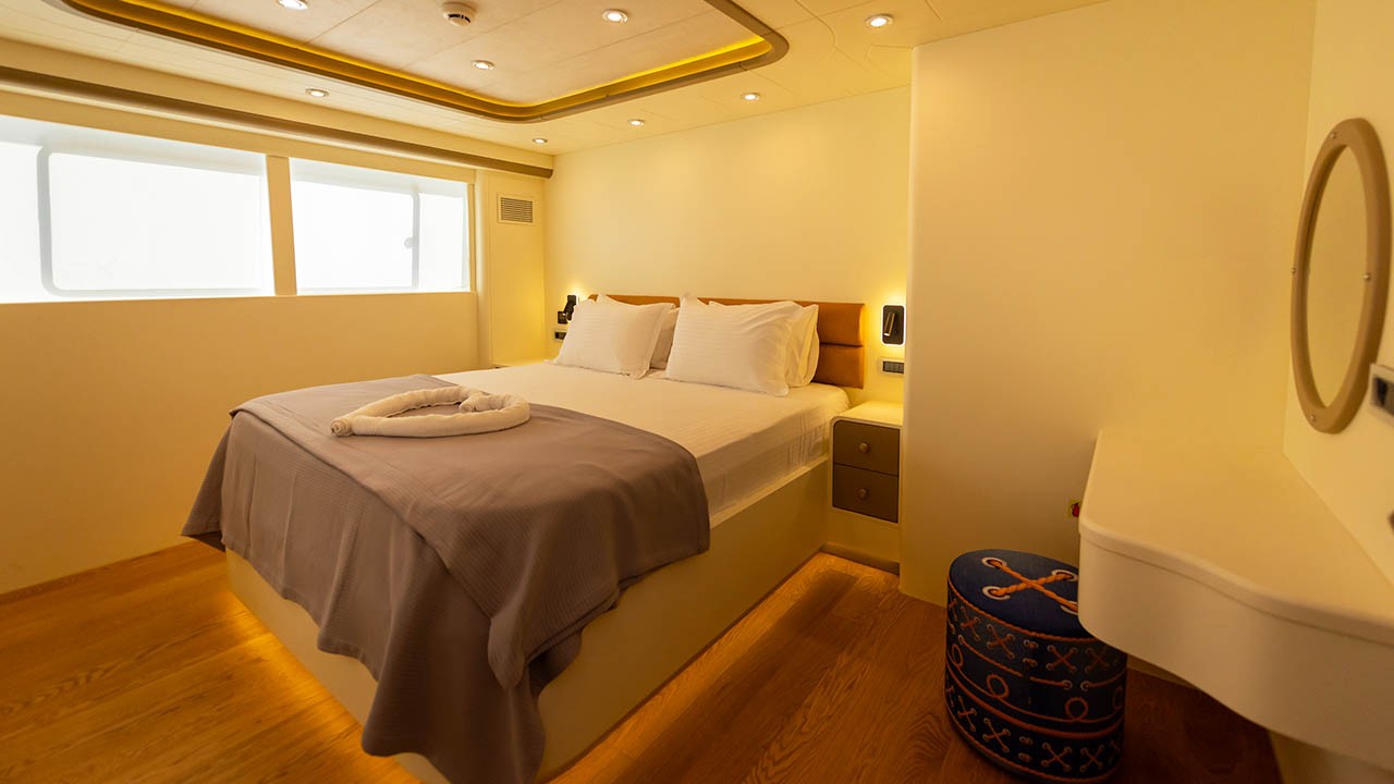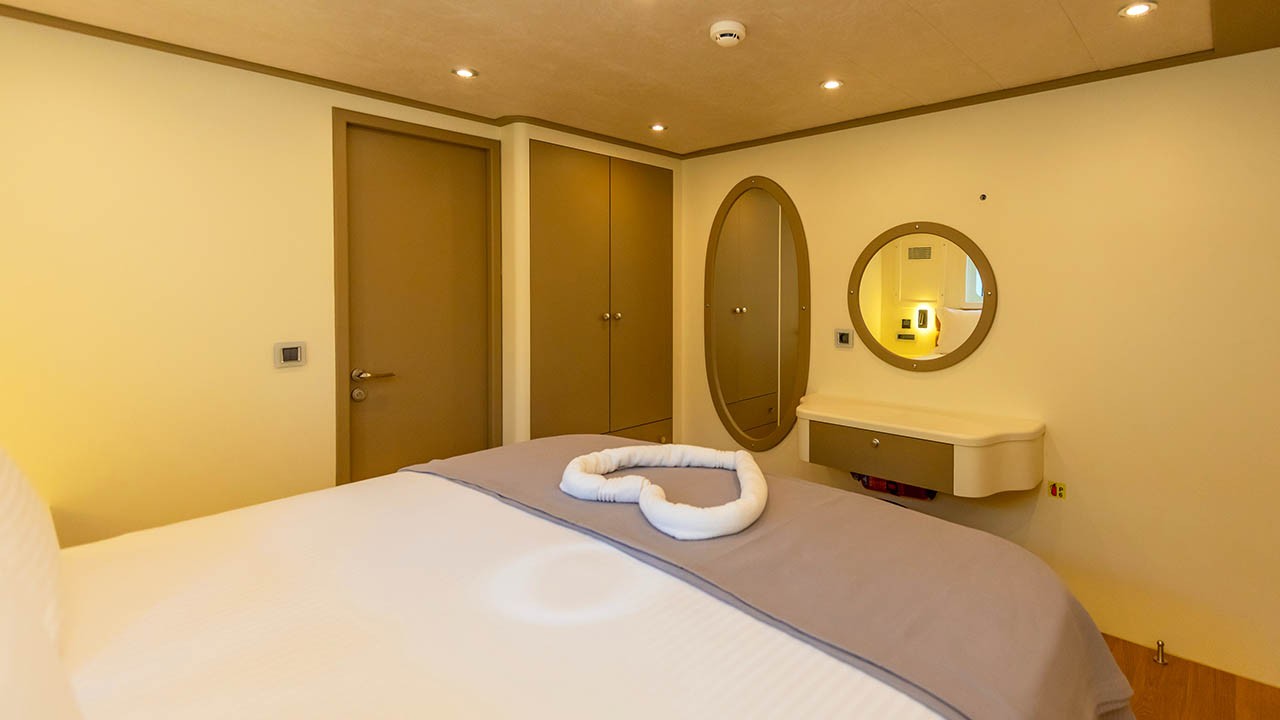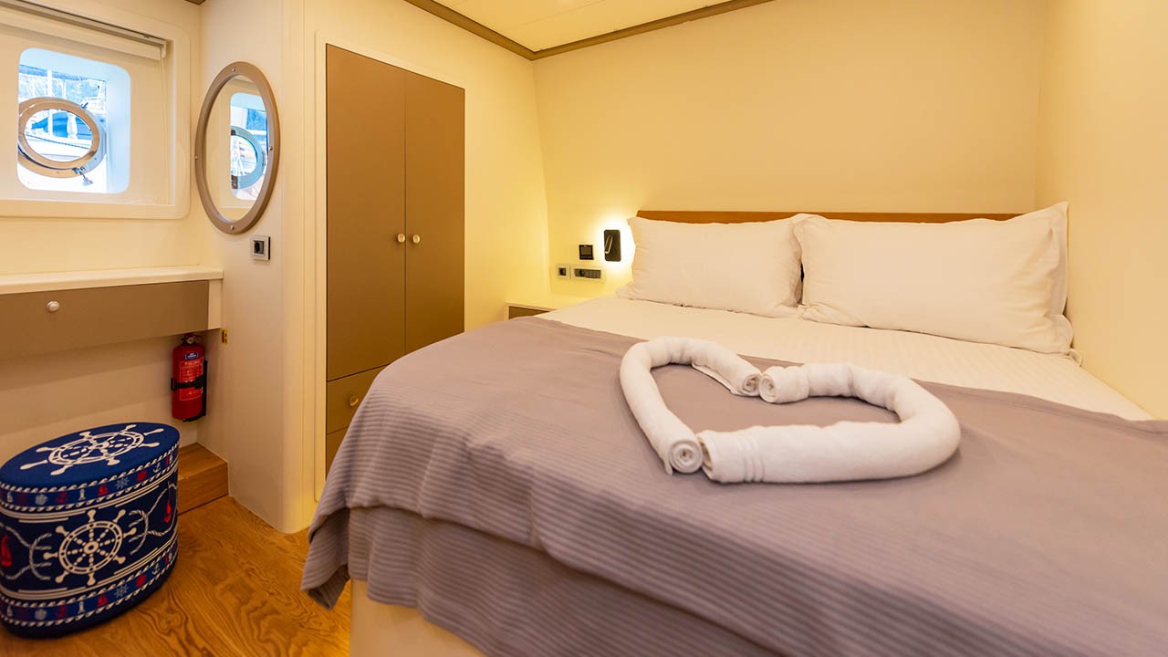 | 6 camarotes: 2 camarotes principales con cama doble y 4 camarotes dobles. Todos los camarotes cuentan con baño privado, aire acondicionado con control remoto individual, TV vía satélite, equipo de música, inodoros con cisterna, secador de pelo y extintores. |