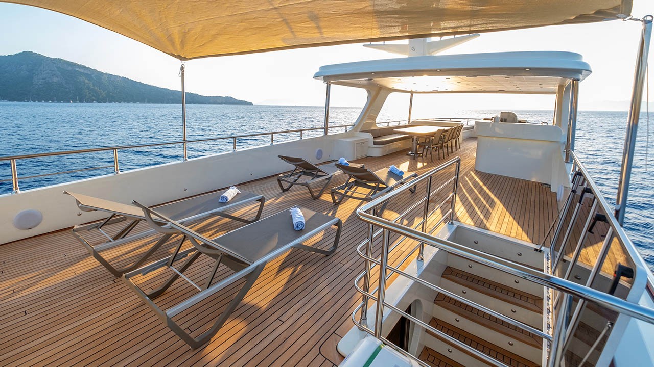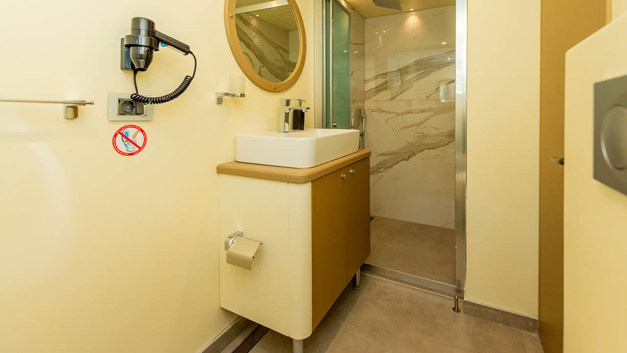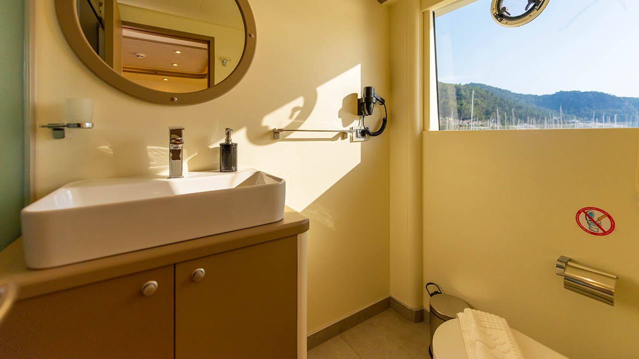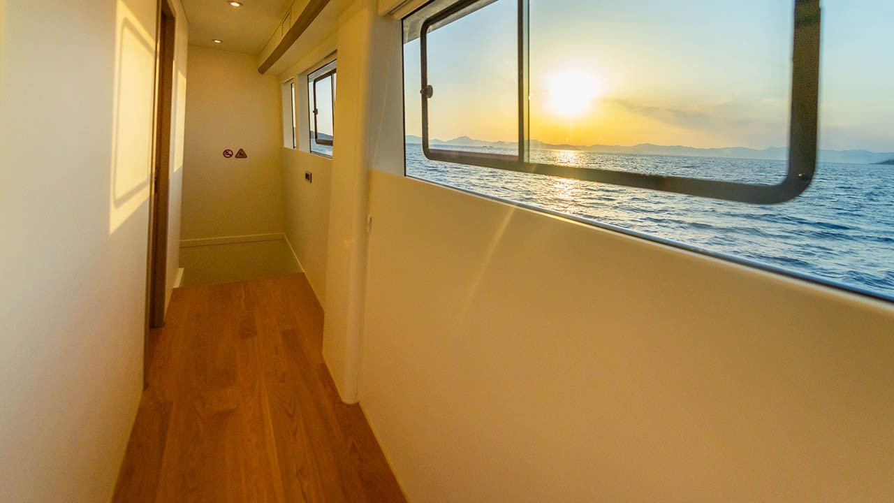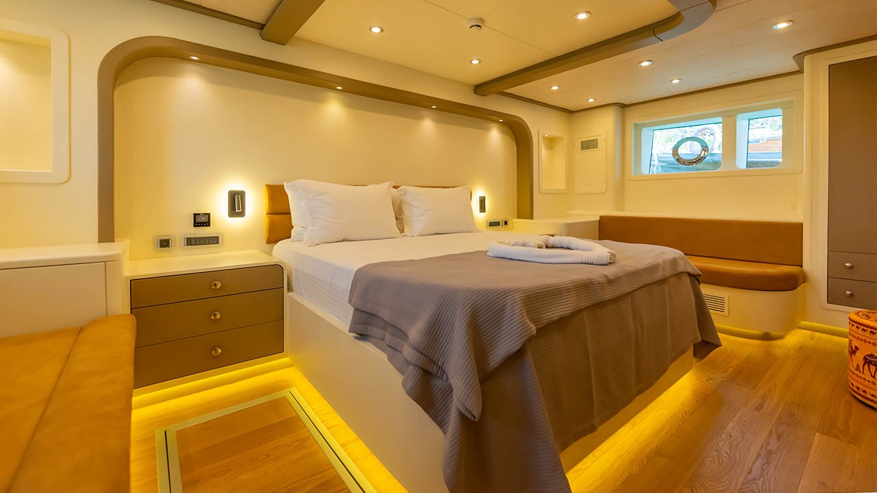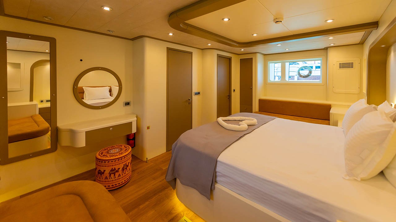 | 6 camarotes: 2 camarotes principales con cama doble y 4 camarotes dobles. Todos los camarotes cuentan con baño privado, aire acondicionado con control remoto individual, TV vía satélite, equipo de música, inodoros con cisterna, secador de pelo y extintores. |